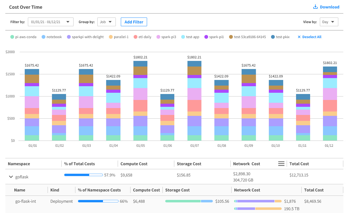 Instead of seeing the cost of an entire cluster, you can see costs broken down into namespaces and individual workloads within each namespace, and you can filter according to your container labels and annotations. This information is further broken down into compute and storage costs for each workload. This enables you to understand the costs of your cloud infrastructure and provides an essential tool for managing your cloud expenses.